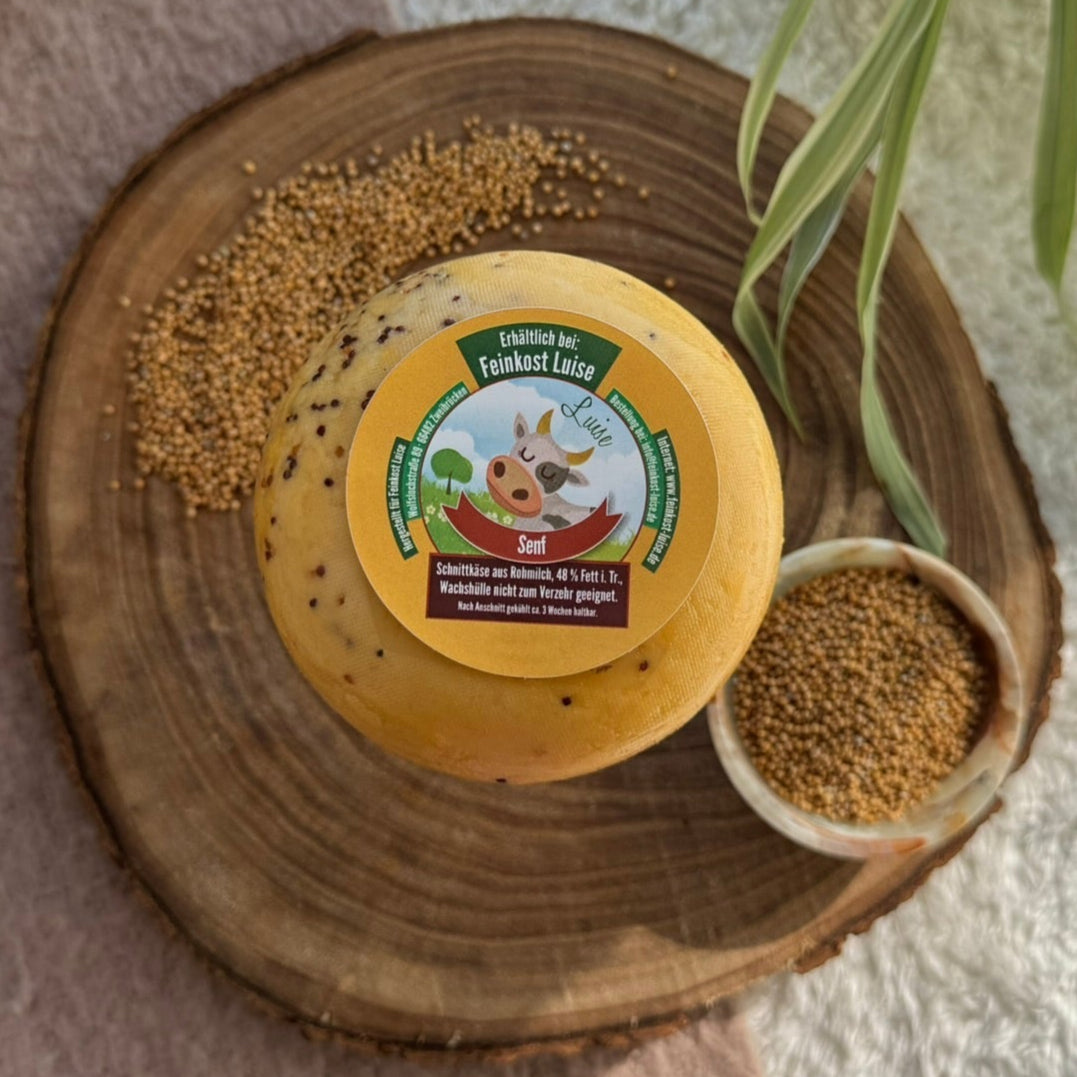 Unser Kuh-Käse Senf vereint cremigen Rohmilchkäse mit einer feinen, leicht scharfen Senfnote. Hergestellt in traditioneller Handwerkskunst, bietet dieser Käse ein außergewöhnliches Geschmackserlebnis, das perfekt zu herzhaften Snacks und rustikalen Gerichten passt.